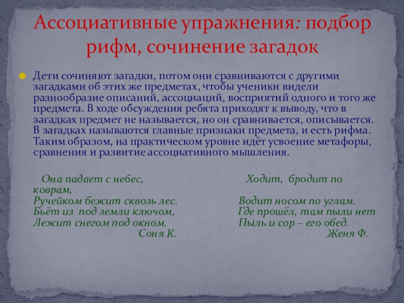 Ассоциативные упражнения: подбор рифм, сочинение загадок