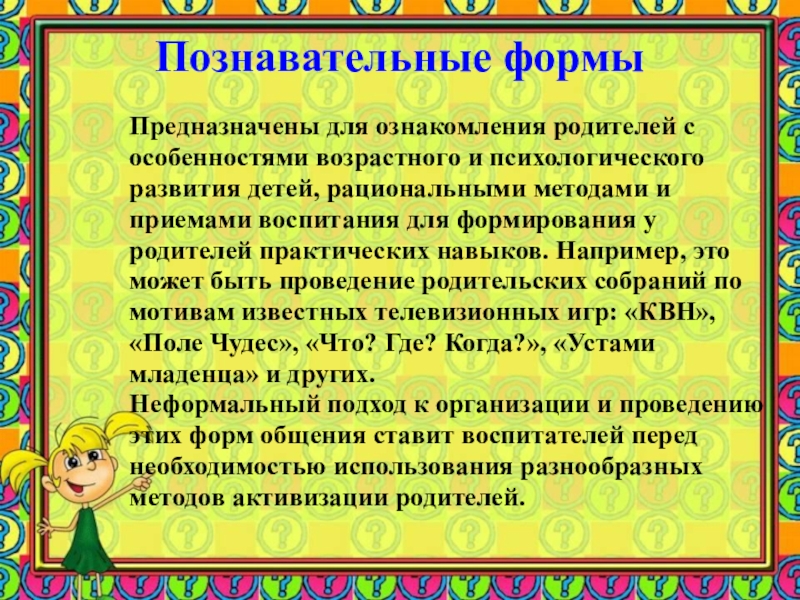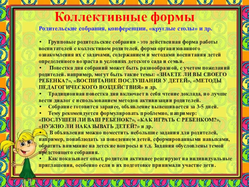 предусматривают диалог, его ведет организатор беседы. Педагог стремится дать родителям