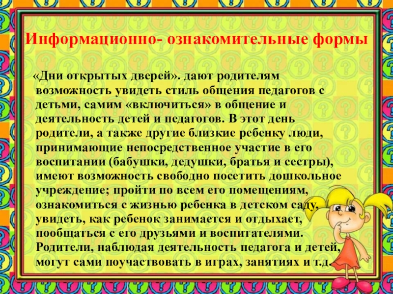 увидеть стиль общения педагогов с детьми, самим «включиться» в общение и деятельность детей и педагогов. В этот день родители, а также другие близкие ребенку люди, принимающие непосредственное участие в его воспитании (бабушки, дедушки, братья и сестры), имеют возможность свободно посетить дошкольное учреждение; пройти по всем его помещениям, ознакомиться с жизнью ребенка в детском саду, увидеть, как ребенок занимается и отдыхает, пообщаться с его друзьями и воспитателями. Родители, наблюдая деятельность педагога и детей, могут сами поучаствовать в играх, занятиях и т.д.