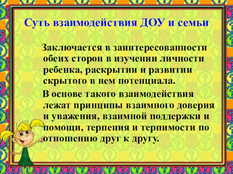 Слайд 4Суть взаимодействия ДОУ и семьи