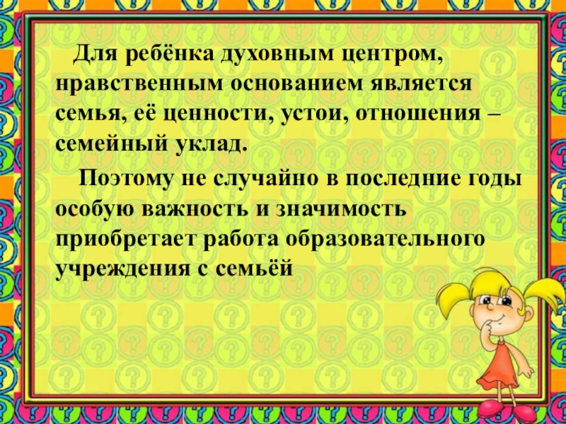 Слайд 2 Для ребёнка духовным центром, нравственным основанием является