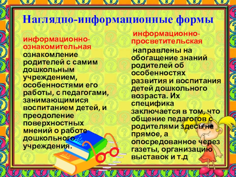 направлены на обогащение знаний родителей об особенностях развития и воспитания детей дошкольного возраста. Их специфика заключается в том, что общение педагогов с родителями здесь не прямое, а опосредованное через газеты, организацию выставок и т.д