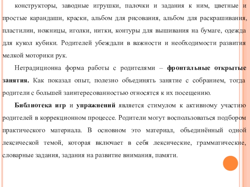 Библиотека игр и упражнений является стимулом к активному участию родителей в коррекционном процессе. Родители могут воспользоваться подбором практического материала. В основном это материал, объединённый одной лексической темой, которая включает в себя лексические, грамматические, словарные задания, задания на развитие внимания, памяти.
