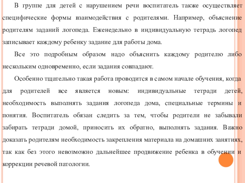 Особенно тщательно такая работа проводится в самом начале обучения, когда для родителей все является новым: индивидуальные тетради детей, необходимость выполнять задания логопеда дома, специальные термины и понятия. Воспитатель обязан следить за тем, чтобы родители не забывали забирать тетради домой, приносить их обратно, выполнять задания. Важно доказать родителям необходимость закрепления материала на домашних занятиях, так как без этого невозможно дальнейшее продвижение ребенка в обучении и коррекции речевой патологии.