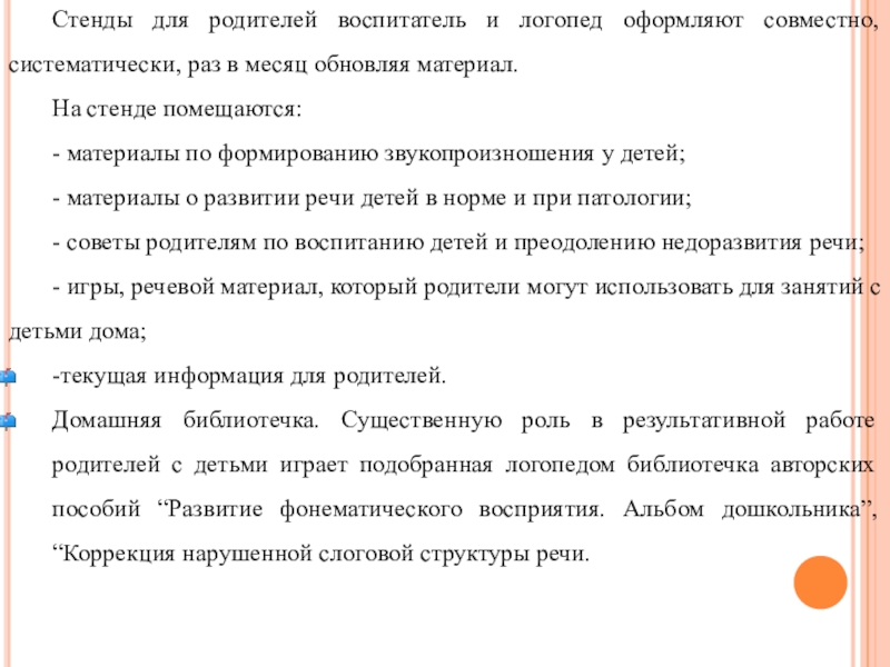 Слайд 17Стенды для родителей воспитатель и логопед оформляют совместно, систематически, раз в