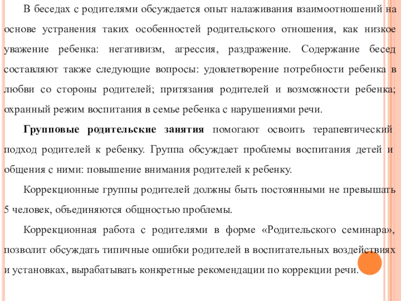 таких особенностей родительского отношения, как низкое уважение ребенка: негативизм, агрессия, раздражение. Содержание бесед составляют также следующие вопросы: удовлетворение потребности ребенка в любви со стороны родителей; притязания родителей и возможности ребенка; охранный режим воспитания в семье ребенка с нарушениями речи.