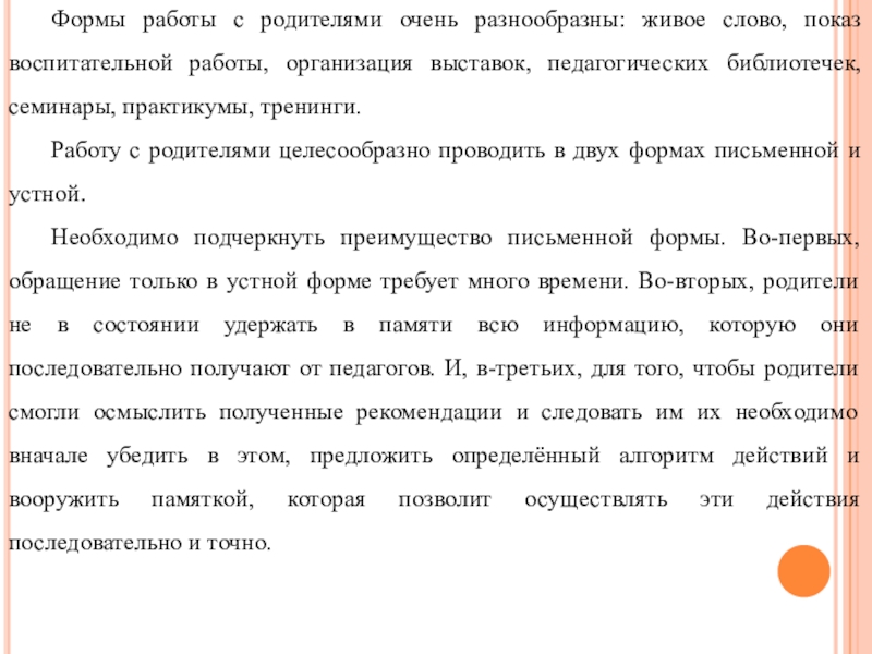 Работу с родителями целесообразно проводить в двух формах письменной и устной.