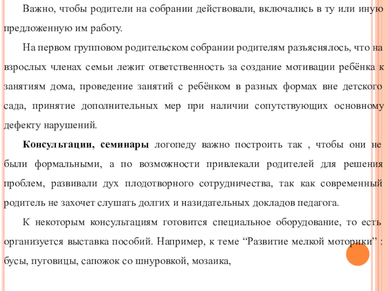 Консультации, семинары логопеду важно построить так , чтобы они не были формальными, а по возможности привлекали родителей для решения проблем, развивали дух плодотворного сотрудничества, так как современный родитель не захочет слушать долгих и назидательных докладов педагога.