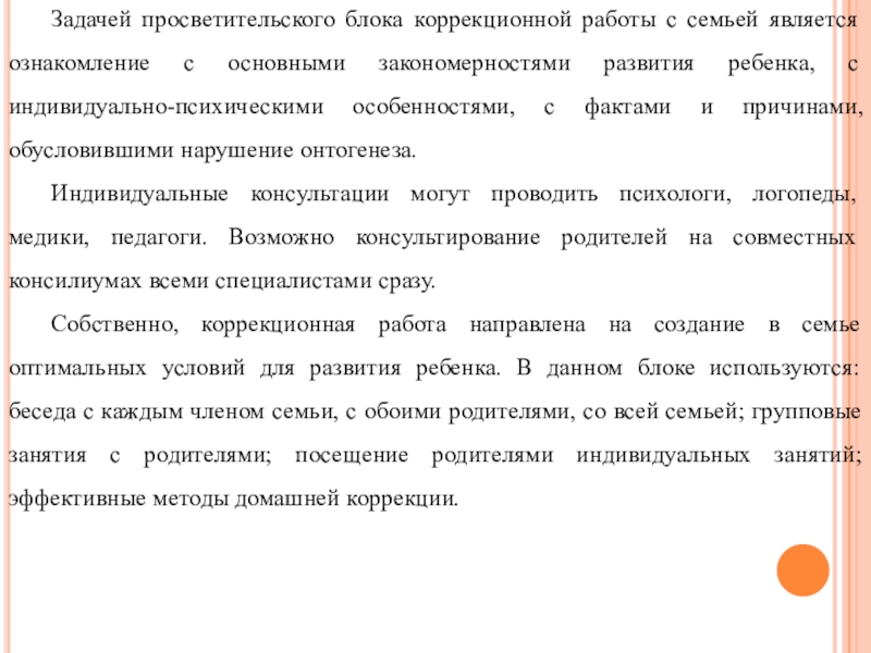 Слайд 23Задачей просветительского блока коррекционной работы с семьей является ознакомление с основными
