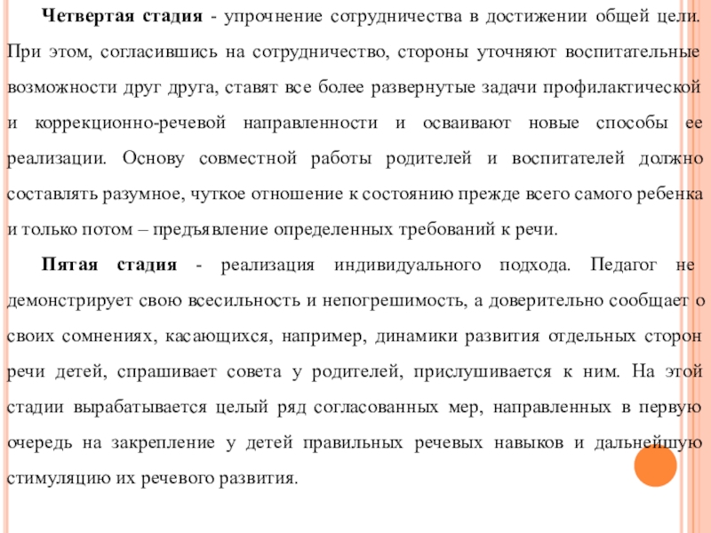 Пятая стадия - реализация индивидуального подхода. Педагог не демонстрирует свою всесильность и непогрешимость, а доверительно сообщает о своих сомнениях, касающихся, например, динамики развития отдельных сторон речи детей, спрашивает совета у родителей, прислушивается к ним. На этой стадии вырабатывается целый ряд согласованных мер, направленных в первую очередь на закрепление у детей правильных речевых навыков и дальнейшую стимуляцию их речевого развития.