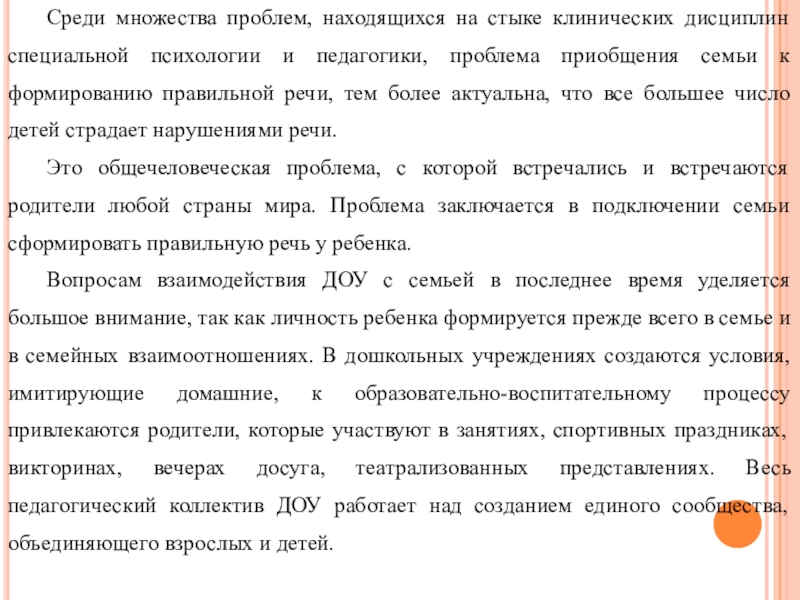 педагогики, проблема приобщения семьи к формированию правильной речи, тем более актуальна, что все большее число детей страдает нарушениями речи.