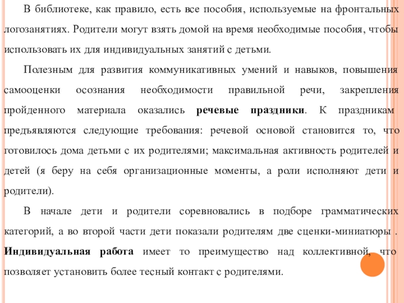 В начале дети и родители соревновались в подборе грамматических категорий, а во второй части дети показали родителям две сценки-миниатюры . Индивидуальная работа имеет то преимущество над коллективной, что позволяет установить более тесный контакт с родителями.