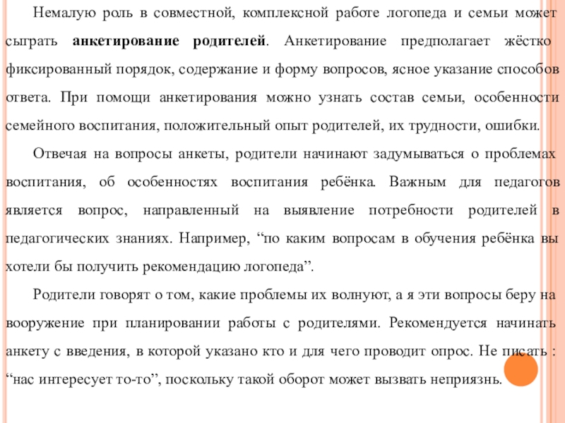 Отвечая на вопросы анкеты, родители начинают задумываться о проблемах воспитания, об особенностях воспитания ребёнка. Важным для педагогов является вопрос, направленный на выявление потребности родителей в педагогических знаниях. Например, “по каким вопросам в обучения ребёнка вы хотели бы получить рекомендацию логопеда”.