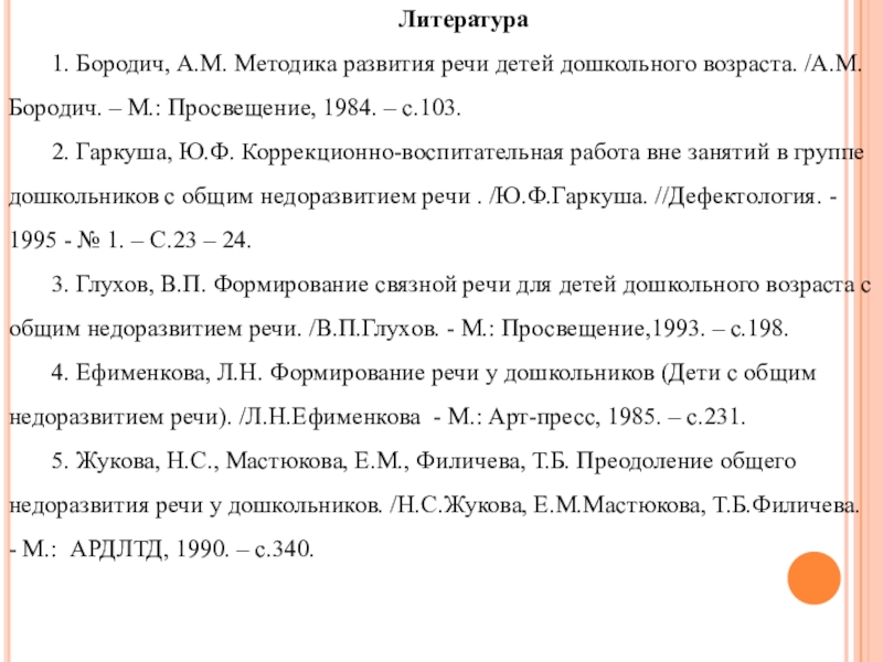 5. Жукова, Н.С., Мастюкова, Е.М., Филичева, Т.Б. Преодоление общего недоразвития речи у дошкольников. /Н.С.Жукова, Е.М.Мастюкова, Т.Б.Филичева. - М.: АРДЛТД, 1990. – с.340.