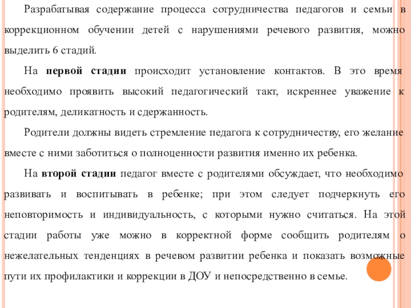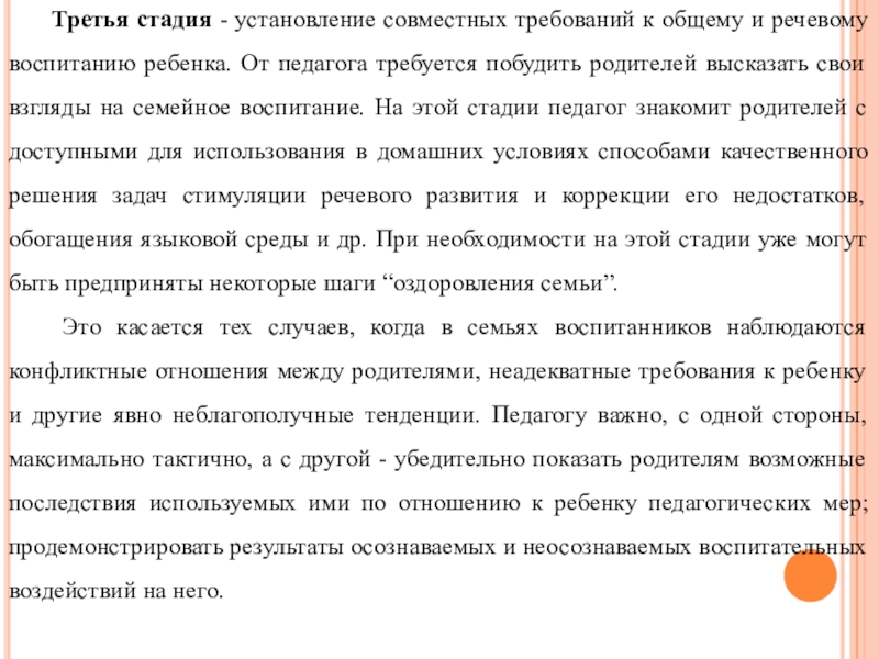 ребенка. От педагога требуется побудить родителей высказать свои взгляды на семейное воспитание. На этой стадии педагог знакомит родителей с доступными для использования в домашних условиях способами качественного решения задач стимуляции речевого развития и коррекции его недостатков, обогащения языковой среды и др. При необходимости на этой стадии уже могут быть предприняты некоторые шаги “оздоровления семьи”.