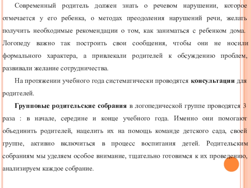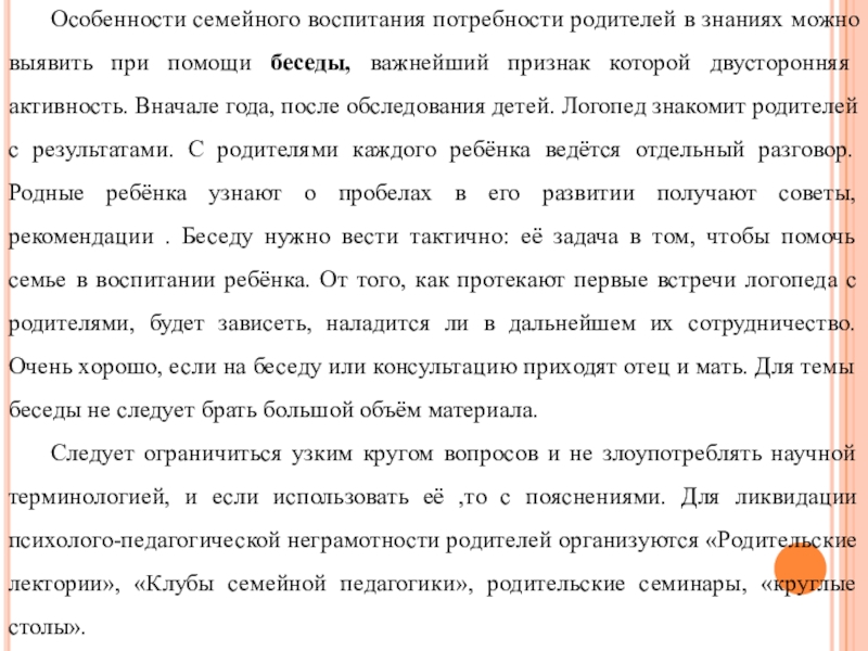 беседы, важнейший признак которой двусторонняя активность. Вначале года, после обследования детей. Логопед знакомит родителей с результатами. С родителями каждого ребёнка ведётся отдельный разговор. Родные ребёнка узнают о пробелах в его развитии получают советы, рекомендации . Беседу нужно вести тактично: её задача в том, чтобы помочь семье в воспитании ребёнка. От того, как протекают первые встречи логопеда с родителями, будет зависеть, наладится ли в дальнейшем их сотрудничество. Очень хорошо, если на беседу или консультацию приходят отец и мать. Для темы беседы не следует брать большой объём материала.