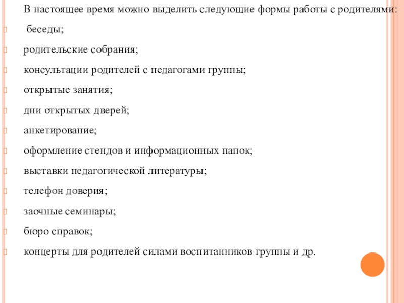 Слайд 9В настоящее время можно выделить следующие формы работы с родителями: