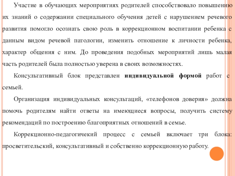 Коррекционно-педагогичекий процесс с семьей включает три блока: просветительский, консультативный и собственно коррекционную работу.
