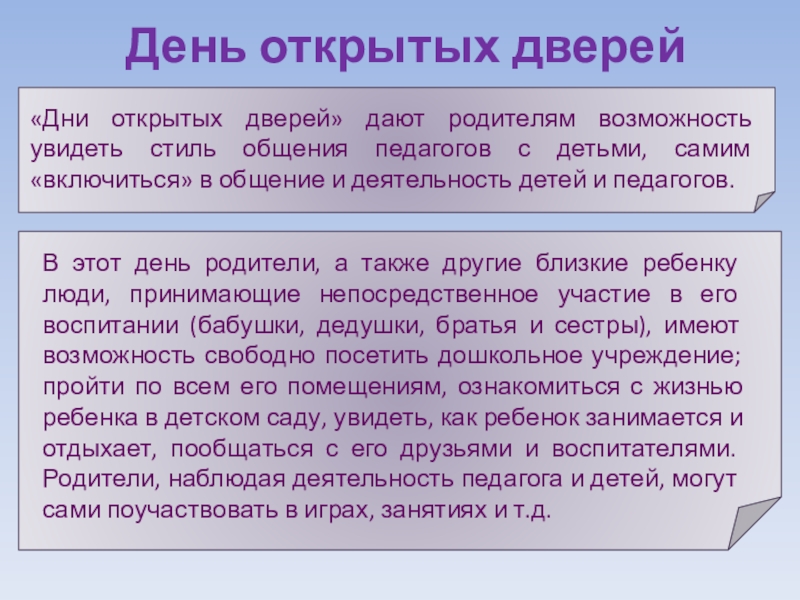 В этот день родители, а также другие близкие ребенку люди, принимающие непосредственное участие в его воспитании (бабушки, дедушки, братья и сестры), имеют возможность свободно посетить дошкольное учреждение; пройти по всем его помещениям, ознакомиться с жизнью ребенка в детском саду, увидеть, как ребенок занимается и отдыхает, пообщаться с его друзьями и воспитателями. Родители, наблюдая деятельность педагога и детей, могут сами поучаствовать в играх, занятиях и т.д.