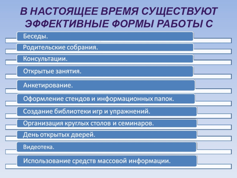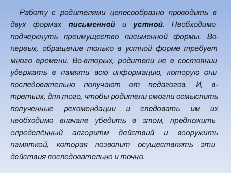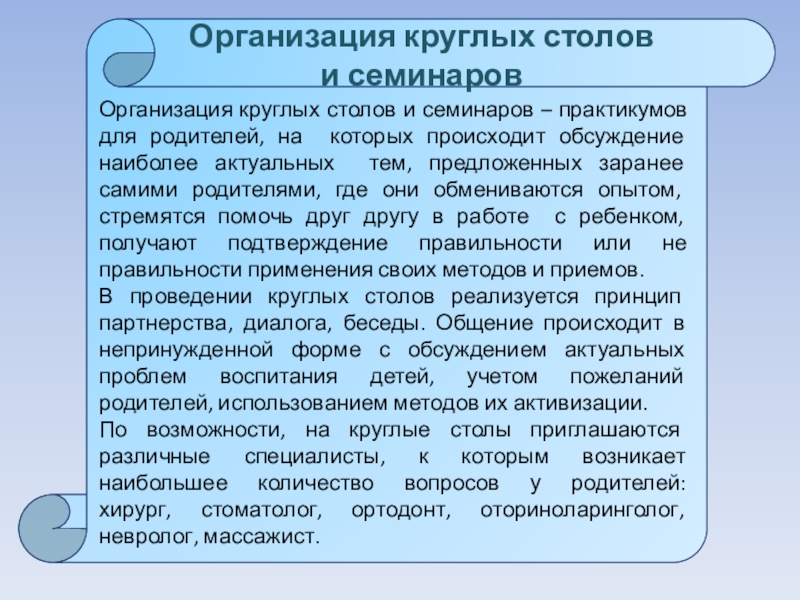Цель беседы — обмен мнениями по тому или иному вопросу; ее особенность — активное участие и логопеда и родителей. Беседа может возникать стихийно по инициативе или родителей или логопеда.