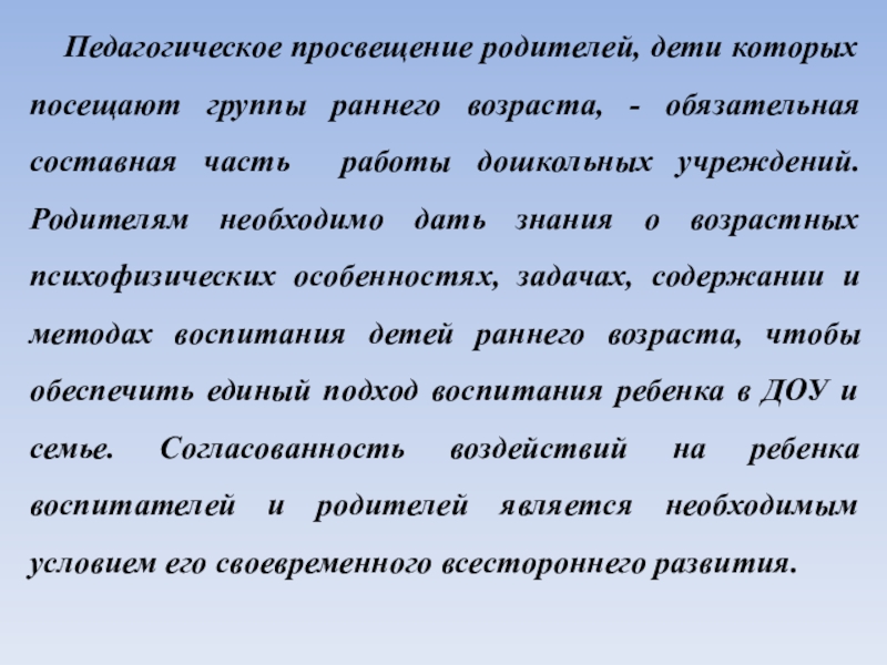 Для родителей, имеющих детей раннего возраста, организуется секция «Я сам», в которой логопед проводит консультации: «Что делать, если ребенок не говорит», «Научите меня говорить правильно», «Чтобы ребенок не заикался». Здесь в доступной форме объясняется, что и в какие периоды должно настораживать в развитии ребенка, о чем и как разговаривать с детьми, какие упражнения следует выполнять для развития артикуляционной моторики, как играть с пальчиками, какие книги читать. В родительском уголке помещается информация «20 простых советов логопеда». Работа по профилактике речевых нарушений в раннем возрасте продолжается воспитателями в группе под руководством логопеда.