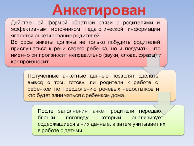 После заполнения анкет родители передают бланки логопеду, который анализирует содержащиеся в них данные, а затем учитывает их в работе с детьми.