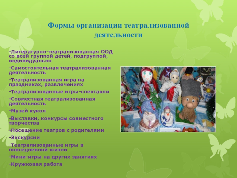 Слайд 20Формы организации театрализованной деятельности