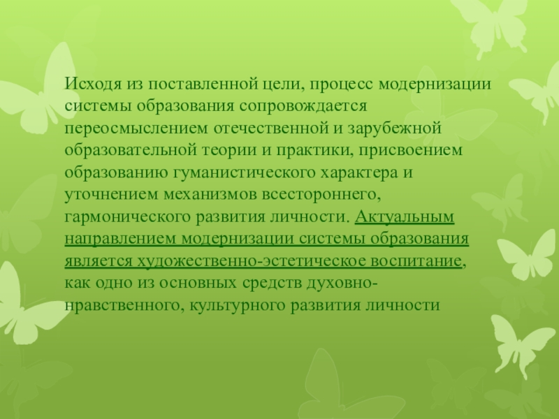 Слайд 3Исходя из поставленной цели, процесс модернизации системы образования сопровождается переосмыслением отечественной