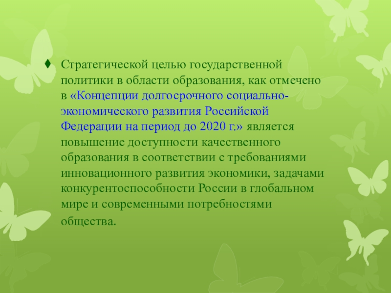 Стратегической целью государственной политики в области образования, как отмечено в «Концепции