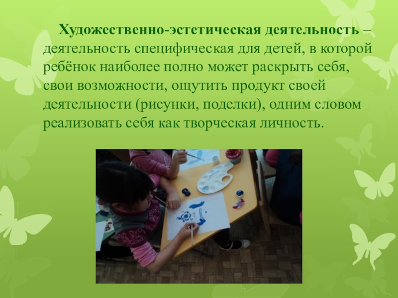 Слайд 5Художественно-эстетическая деятельность – деятельность специфическая для детей, в которой ребёнок наиболее