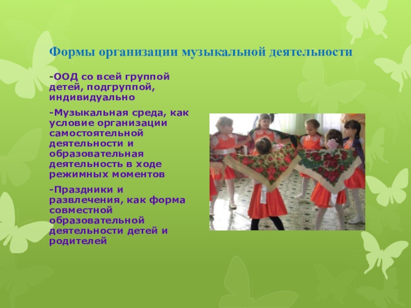 Слайд 19Формы организации музыкальной деятельности