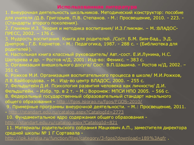 1. Внеурочная деятельность школьников. Методический конструктор: пособие для учителя /Д.В. Григорьев, П.В. Степанов. - М.: Просвещение, 2010. - 223. - (Стандарты второго поколения).