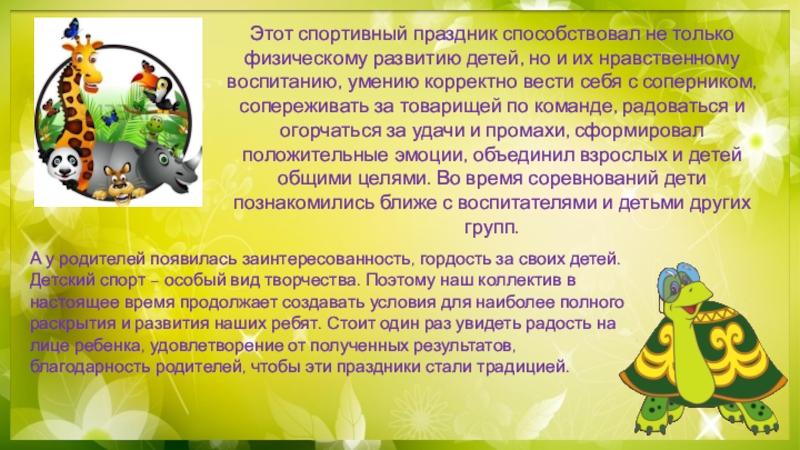 Этот спортивный праздник способствовал не только физическому развитию детей, но и их нравственному воспитанию, умению корректно вести себя с соперником, сопереживать за товарищей по команде, радоваться и огорчаться за удачи и промахи, сформировал положительные эмоции, объединил взрослых и детей общими целями. Во время соревнований дети познакомились ближе с воспитателями и детьми других групп.