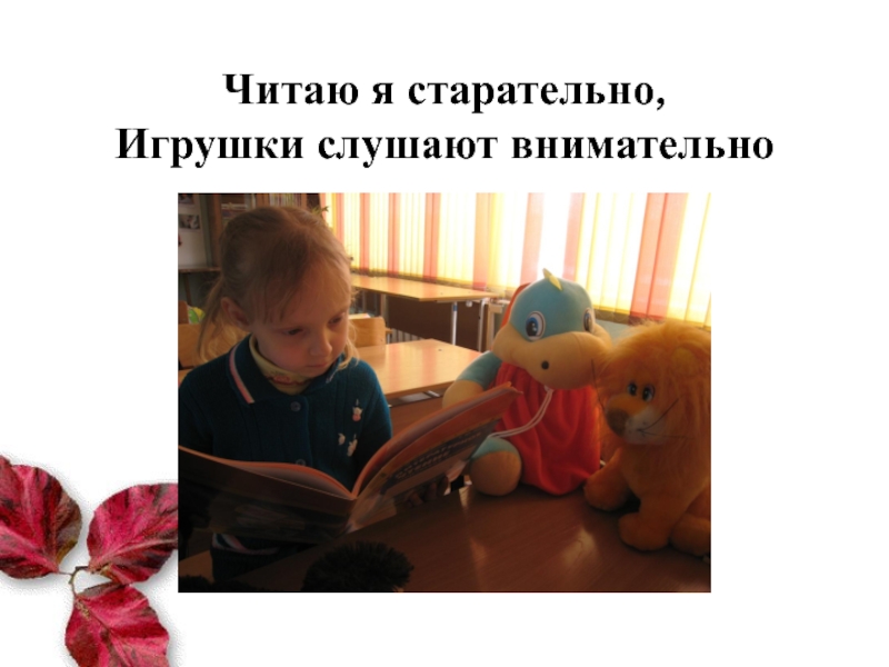 Слайд 5Читаю я старательно, Игрушки слушают внимательно