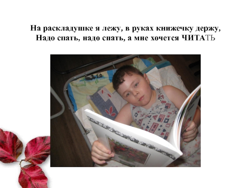 Слайд 3На раскладушке я лежу, в руках книжечку держу, Надо спать, надо спать,