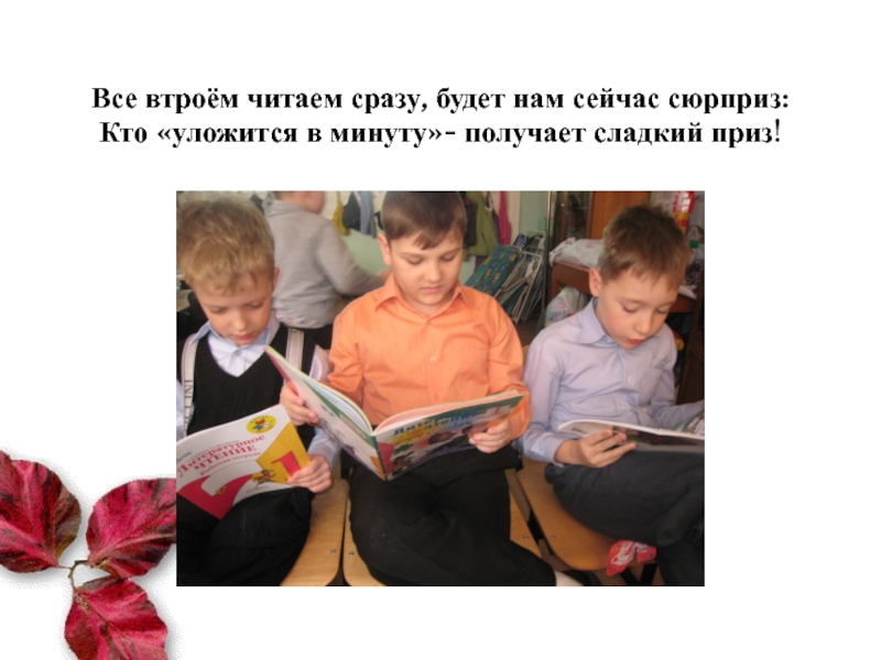 Все втроём читаем сразу, будет нам сейчас сюрприз: Кто «уложится в минуту»- получает сладкий приз!