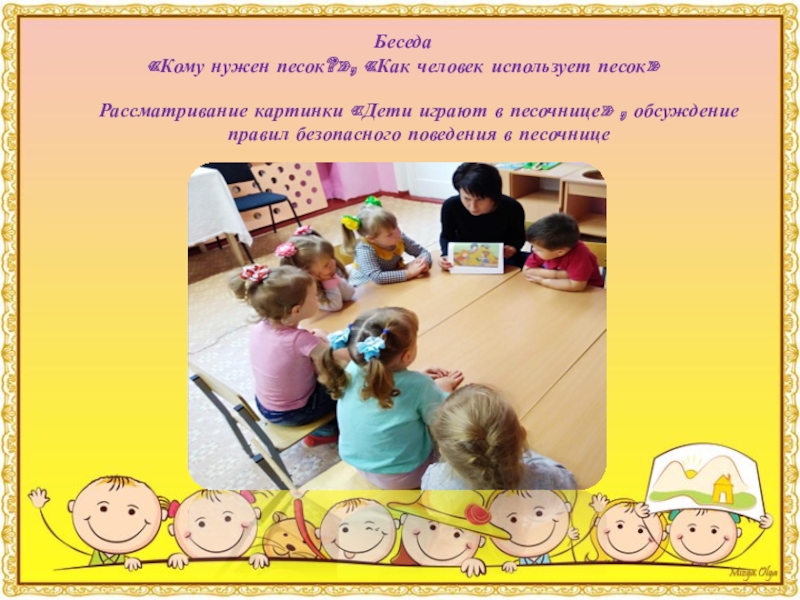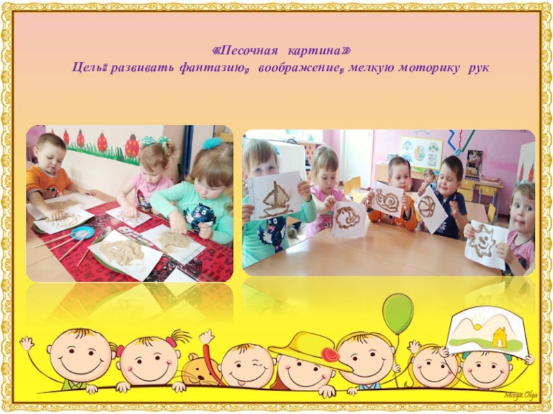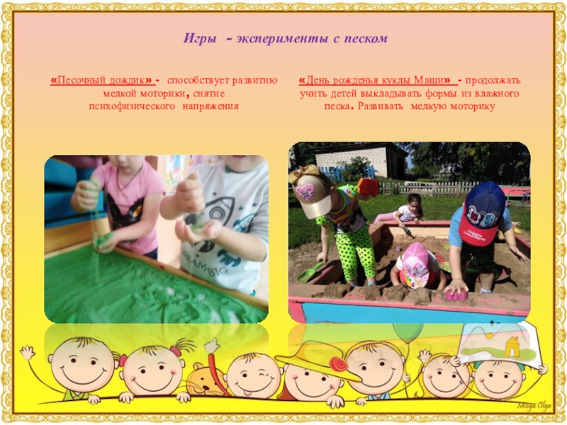 «День рожденья куклы Маши» - продолжать учить детей выкладывать формы из влажного песка. Развивать мелкую моторику