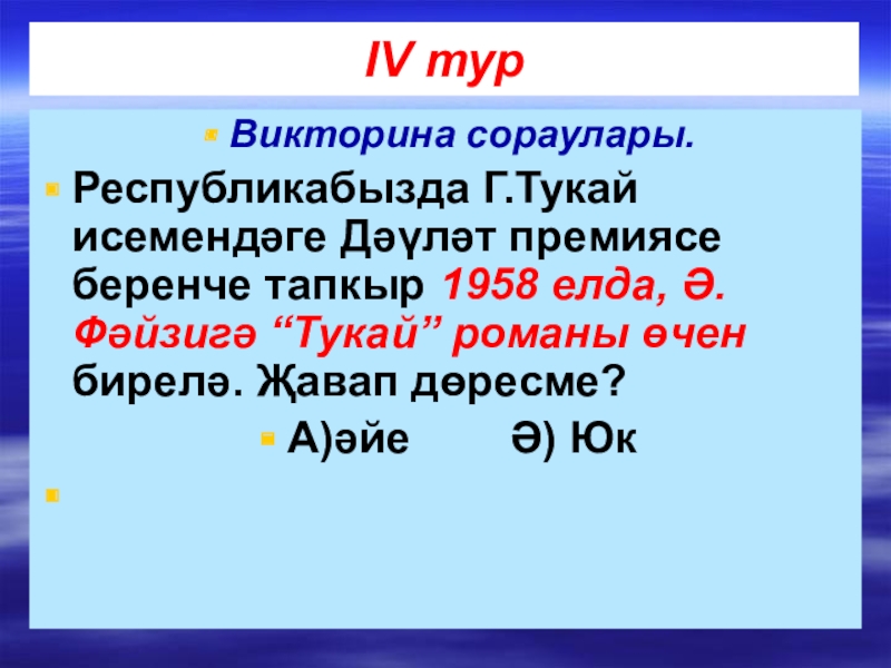 Ә.Фәйзигә “Тукай” романы өчен бирелә. Җавап дөресме?