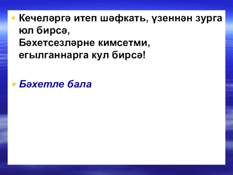 Слайд 10Кечеләргә итеп шәфкать, үзеннән зурга юл бирсә,