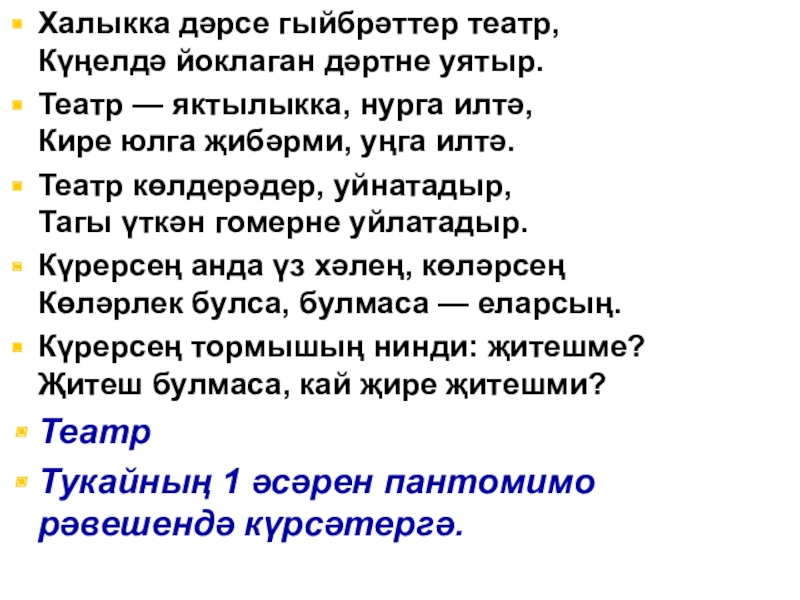 Слайд 13Халыкка дәрсе гыйбрәттер театр,