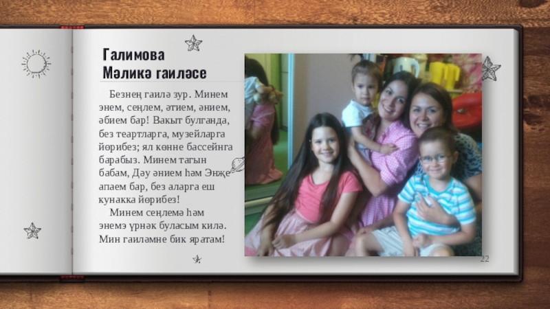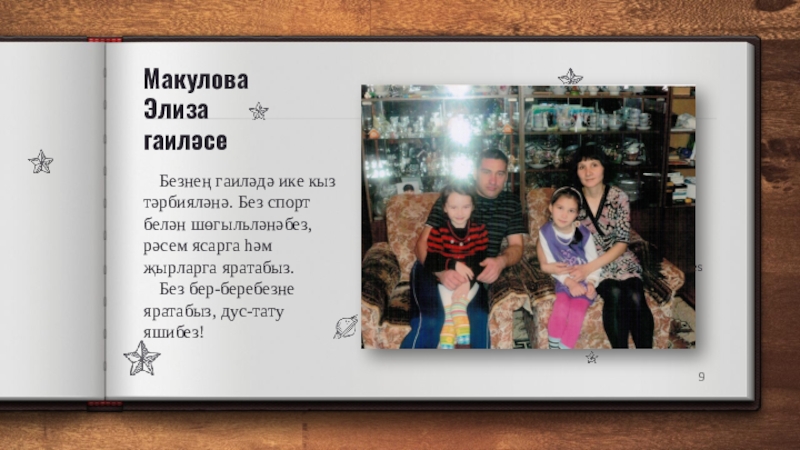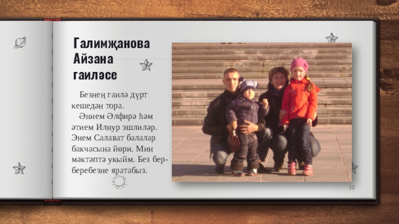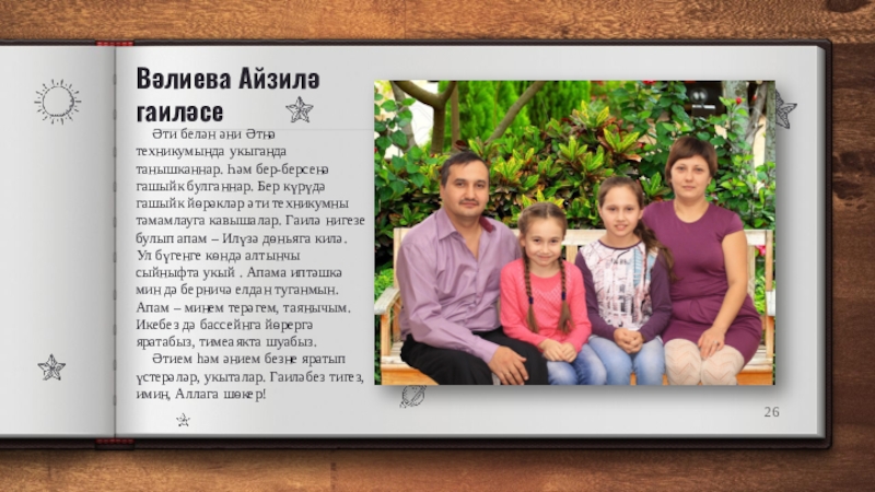 Әтием һәм әнием безне яратып үстерәләр, укыталар. Гаиләбез тигез, имин, Аллага шөкер!