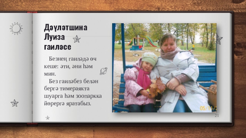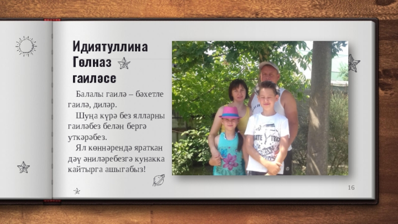 гашыйк булганнар. Бер күрүдә гашыйк йөрәкләр әти техникумны тәмамлауга кавышалар. Гаилә нигезе булып апам – Илүзә дөньяга килә. Ул бүгенге көндә алтынчы сыйныфта укый . Апама иптәшкә мин дә берничә елдан туганмын. Апам – минем терәгем, таянычым. Икебез дә бассейнга йөрергә яратабыз, тимеаякта шуабыз.