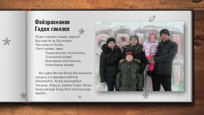 Минем гаиләм дүрт кешедән тора: әтием, әнием, мин, абыем Ранис. Безнең гаиләбез бик дус. Шундый гаиләдә яшәвемә мин бик шат!