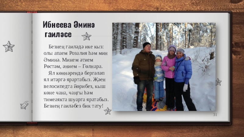 Без бер-беребезне бик яратабыз. Бөтенебез бергә булганда миңа бик күңелле. Мин рәсем ясарга яратам. Җәй көннәрендә табигатькә чыгабыз. Кыш көннәрендә чана, чаңгы шуарга барабыз.