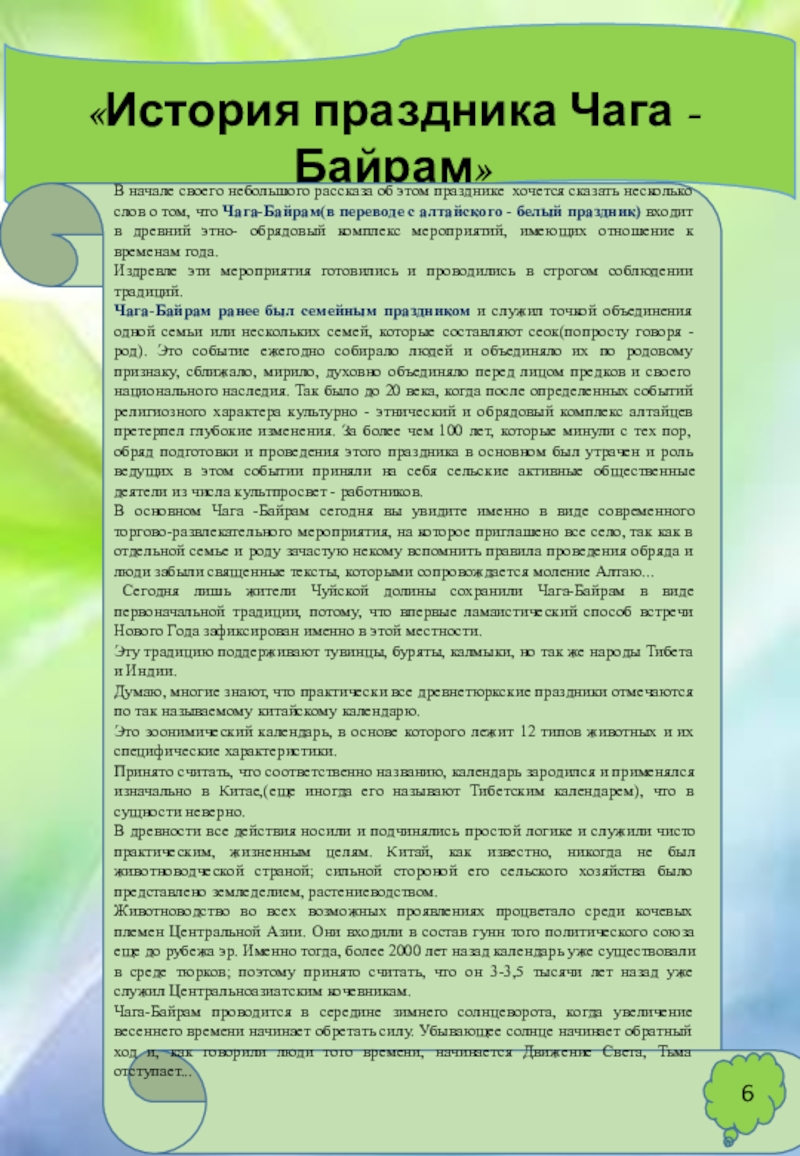 празднике хочется сказать несколько слов о том, что Чага-Байрам(в переводе с алтайского - белый праздник) входит в древний этно- обрядовый комплекс мероприятий, имеющих отношение к временам года.