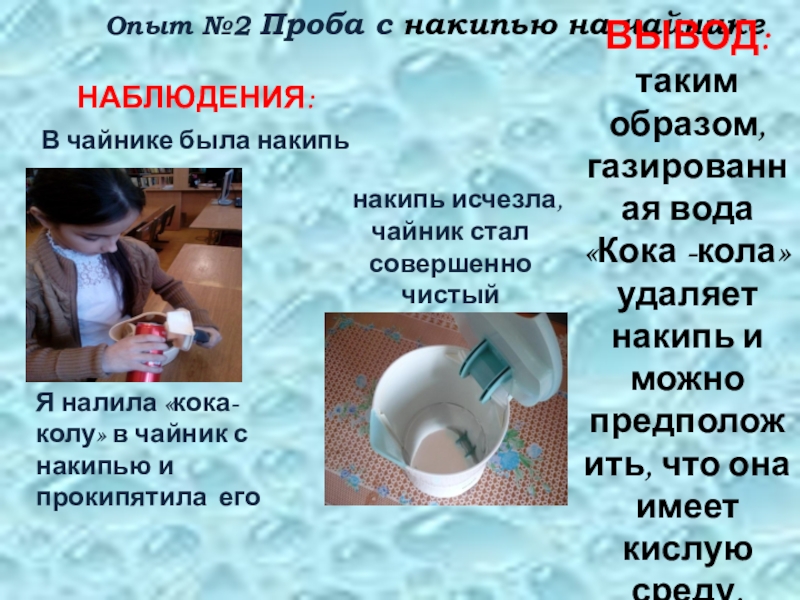 таким образом, газированная вода «Кока -кола» удаляет накипь и можно предположить, что она имеет кислую среду.