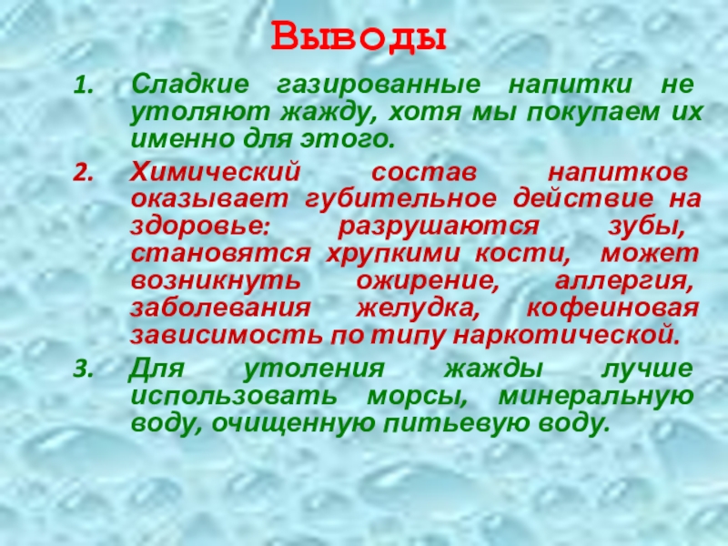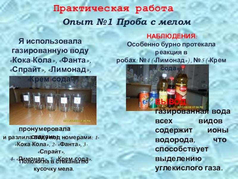 ВЫВОД: газированная вода всех видов содержит ионы водорода, что способствует выделению углекислого газа.