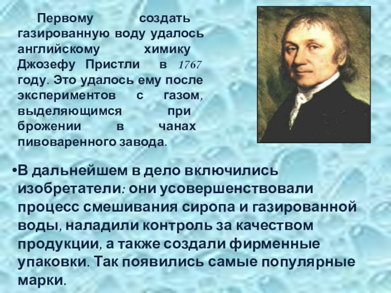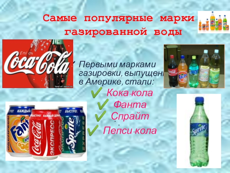 В дальнейшем в дело включились изобретатели: они усовершенствовали процесс смешивания сиропа и газированной воды, наладили контроль за качеством продукции, а также создали фирменные упаковки. Так появились самые популярные марки.