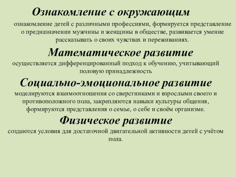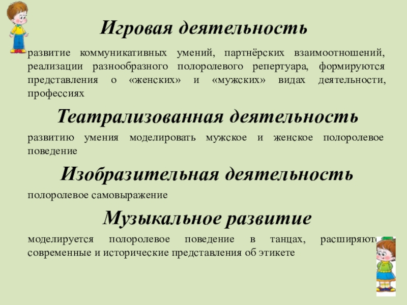 моделируются взаимоотношения со сверстниками и взрослыми своего и противоположного пола, закрепляются навыки культуры общения, формируются представления о семье, о себе и своём организме.