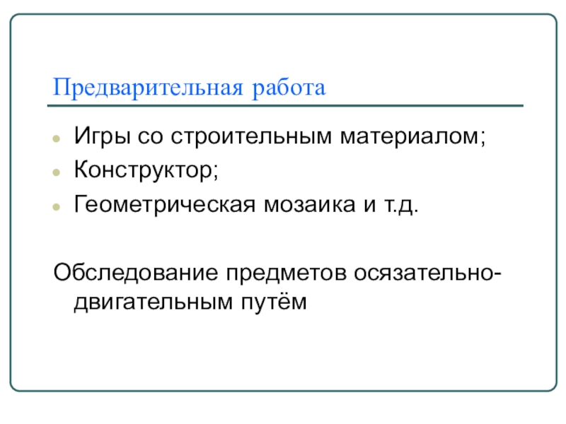 Предварительная работаИгры со строительным материалом;Конструктор;Геометрическая мозаика и т.д.Обследование предметов осязательно-двигательным путём